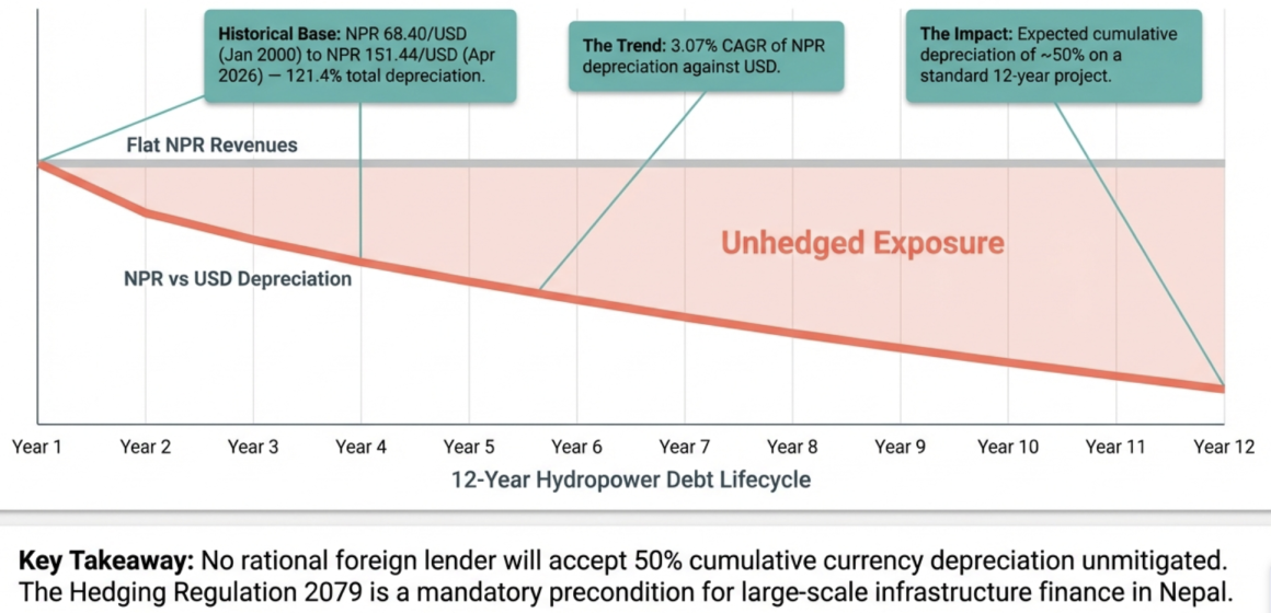 Nepal’s Hedging Regulation 2079 was issued under Section 22 of the Foreign Exchange (Regulation) Act 2019, replacing the earlier Hedging Regulation 2075. It attempts to solve a specific, well-documented problem: foreign investors willing to finance Nepal’s infrastructure – particularly hydropower, transmission, and transport – face unhedgeable currency risk. Revenue from these projects accrues in Nepali Rupees (NPR), but debt service on foreign loans must be paid in foreign currency. With the NPR depreciating against the USD at a compound annual rate of 3.07% over the past 26 years (from NPR 68.40/USD in January 2000 to NPR 151.44/USD in April 2026, a total depreciation of 121.4%), unhedged foreign debt in a 12-year hydropower project faces an expected cumulative depreciation of approximately 50%, with a worst-case historical precedent of 83.9%. No rational lender will accept this risk unmitigated.
