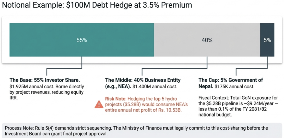 Quantifying the fiscal exposure. If Nepal were to hedge foreign debt across the five largest hydropower projects currently in the IBN pipeline (Arun-3 at $1.04B, Upper Karnali at $1.05B, Tamor at $1.2B, West Seti at $1.32B, Lower Arun at $670M – total approximately $5.28B), the government’s 5% share at a 3.5% annual premium would be approximately $9.24 million per year. This is a modest fiscal commitment relative to the government’s total annual expenditure of approximately Rs. 1,512.98 billion (~$12B) for FY 2081/82, representing less than 0.1% of total expenditure. However, no budget line item currently exists for this purpose, and no appropriation mechanism has been established.