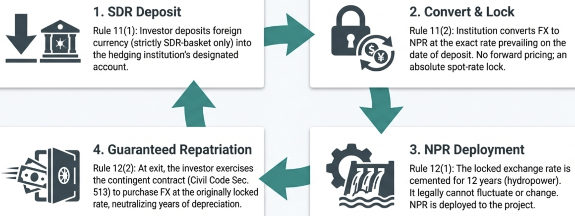The regulation’s premise is straightforward: allow designated institutions to lock the exchange rate at the time foreign currency enters Nepal, so the investor can repatriate principal and interest at the same rate regardless of subsequent depreciation, with the hedging cost shared among the government, a state entity, and the project. Since its enactment, no hedging transaction has been completed under the regulation. This analysis examines why.