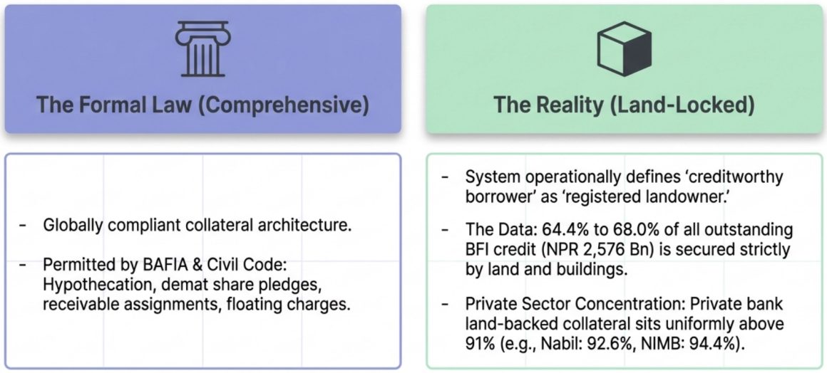 These are not incidental problems. They are structural symptoms of a credit system that has operationally defined a creditworthy borrower as a registered landowner – not because law requires this, not because economics demands it, but because land is the only asset class for which Nepal has built an administrative infrastructure closest to satisfying all four conditions a rational lender requires: reliable creation, real-time searchability, third-party exclusion, and reasonably predictable enforcement – but with constraints (discussed later).