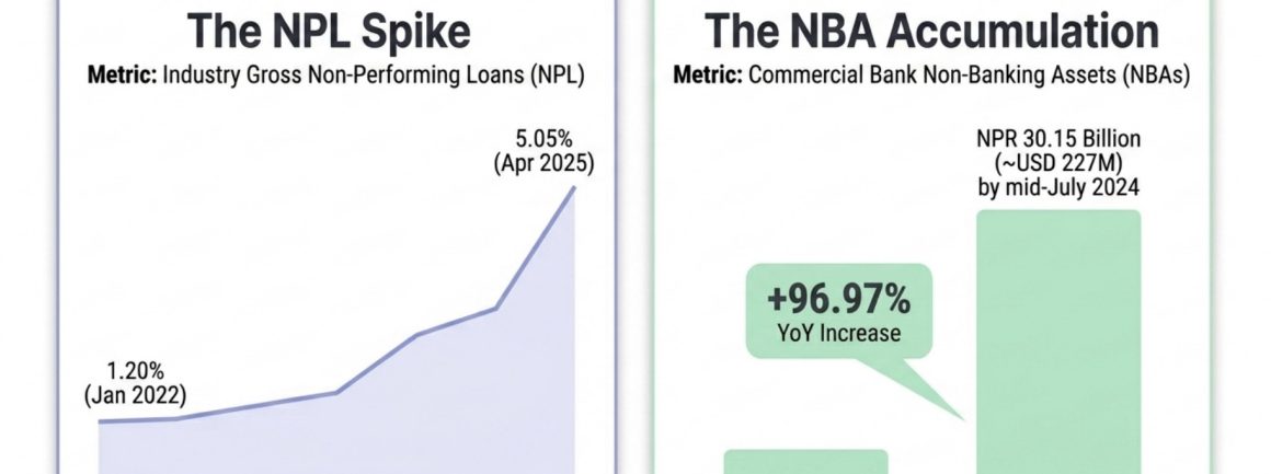 In practice, it is not. Between 60.8% and 68.0% of all outstanding BFI credit has been secured by land and buildings throughout the decade 2016–2025, peaking at 68.0% in 2023 and standing at 64.4% as of November 2025 (NRB Current Macroeconomic and Financial Situation Reports, 2016–2026). At approximately NPR 2,576 billion (~USD 19.1 billion at NPR 135/USD 1), land-backed credit is the largest single category of financial obligation in Nepal’s formal economy. The Secured Transactions Act, 2006, enacted specifically to build a modern movable asset registry and end this dependence, has remained not much effective for nearly two decades. SME organic credit has stood at 2.6% of commercial bank portfolios when measured without government subsidy – identical in 2016 and 2017, unchanged after a decade of policy attention (NRB CMFS Report 2016/17, Monetary Situation, p.10). The industry Non-Performing Loan (NPL) ratio has risen from 1.20% in early 2022 to 5.05% by April 2025 (NRB CMFS Report November 2025), and commercial bank non-banking assets (NBAs “Non Banking Assets” – properties seized from defaulted borrowers after failed auctions, governed by NRB Unified Directive 2/2081, Clause 11) increased 96.97% in FY 2023/24 alone, reaching NPR 30.15 billion (~USD 226.7 million at NPR 133/USD) (NRB Bank Supervision Report 2023/24, Sections 3.7–3.8).