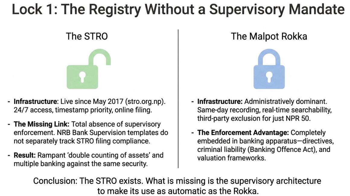 The STRO’s design already replicates the Malpot Rokka’s core features: online notice-filing, real-time public search, priority dating from filing timestamp, and nominal fees (NPR 565 per filing). What it lacks is the institutional embedding that makes the Rokka automatic – mandatory pre-lending searches, post-disbursement filing timelines enforced on-site, and capital consequences for non-compliance enforced at the loan file level. The Malpot Rokka works not only because it is functional but because the entire supervision and credit culture apparatus is built around it. The STRO requires the same surrounding architecture, applied by NRB through its existing directive authority.