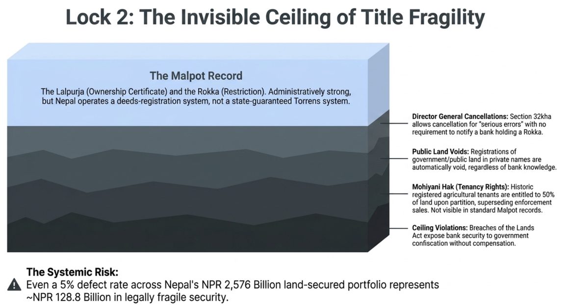 The NRB Bank Supervision Report 2023/24 (Section 5.1.4) explicitly lists “fake collateral” and “false valuation” as emerging categories of banking fraud identified during on-site inspections. The scale of latent title defects across Nepal’s NPR 2,576 billion (~USD 19.1 billion) land-secured credit portfolio is unknown – no systematic title quality audit has been conducted – but even a 5% prevalence of material defects represents approximately NPR 128.8 billion (~USD 954 million at NPR 135/USD) in security whose legal basis is fragile.