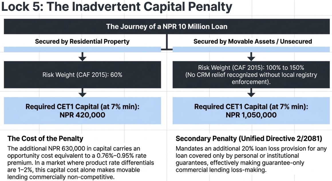 The CAF 2015’s narrow definition of “eligible financial collateral” (yogya vittiya dhitamanpatra) – restricted to own-bank FDRs, physical gold, government securities, and rated institutional guarantees – means that every collateral class outside this tier attracts standard or elevated risk weights regardless of actual quality. This is the correct regulatory response to information asymmetry in the absence of a movable registry. It becomes a perverse incentive the moment a functioning registry is built. The prudential framework is calibrated for the infrastructure Nepal has, not the infrastructure Nepal needs.