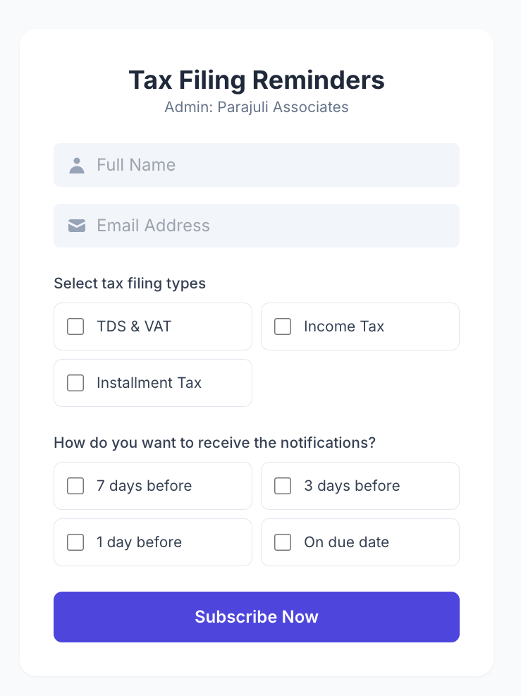 • Personalized Notifications: Subscribe only to the tax filing types that apply to you, such as Monthly VAT, TDS, or Annual ITR.