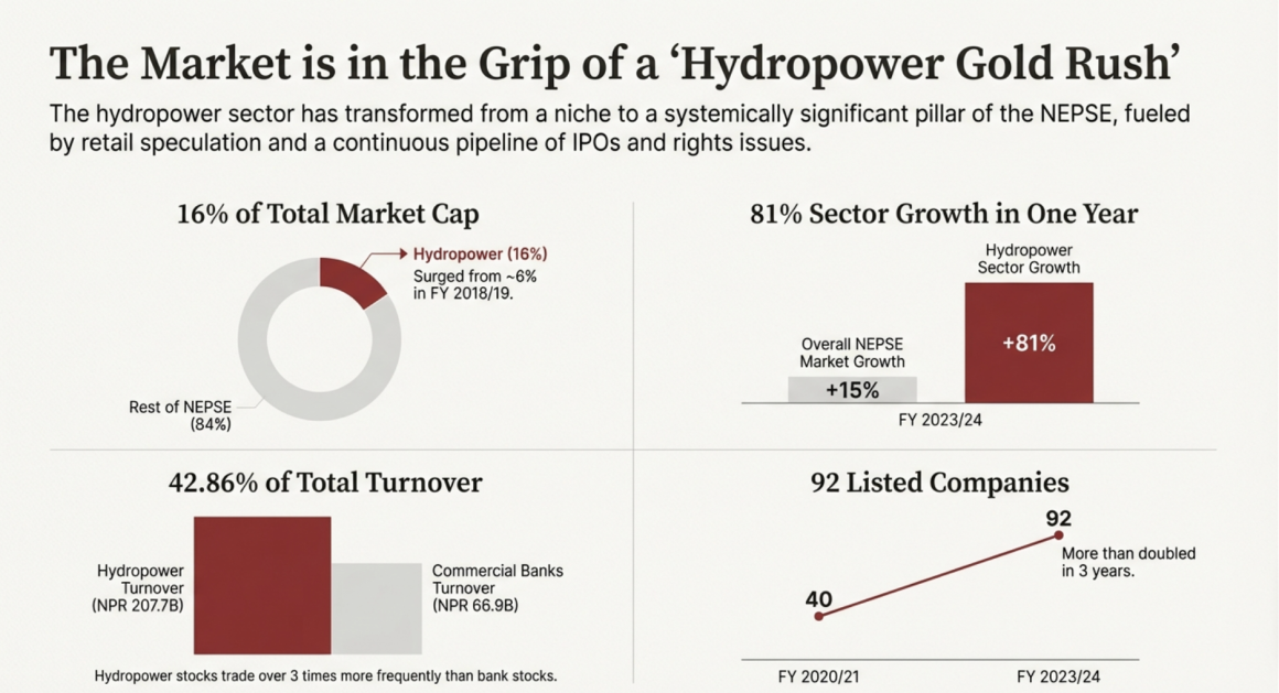 The Nepal Stock Exchange (NEPSE) is presently in the grip of what can best be described as a “Hydropower Gold Rush.” Over the past decade – and with particular intensity since FY 2020/21 – the hydropower sector has emerged as the dominant driver of market activity, eclipsing traditional blue-chip sectors in both trading volume and investor attention. This surge has been fueled by a continuous pipeline of Initial Public Offerings (IPOs) and increasingly aggressive 1:1 (100 percent) right share issuances, which have become the principal instruments through which hydropower companies mobilize large volumes of public capital.