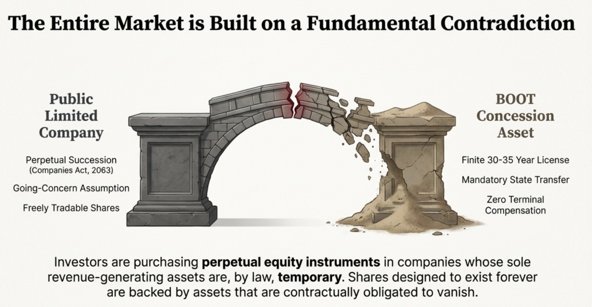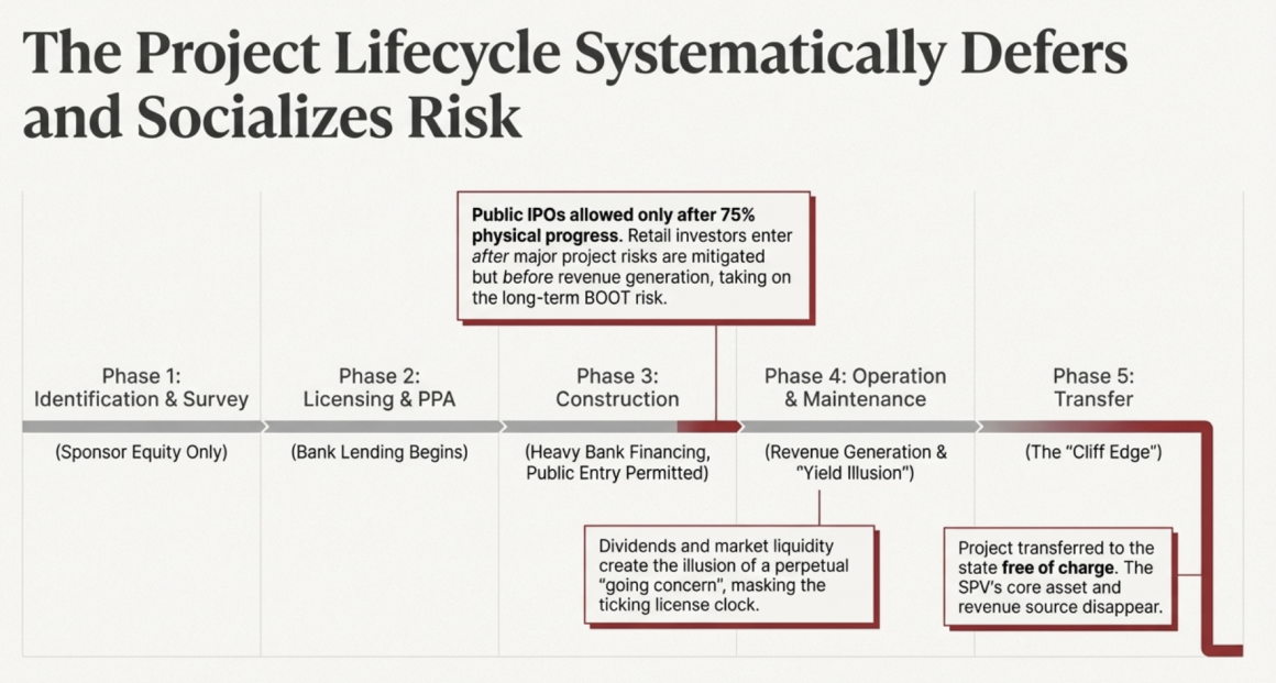 This lifecycle demonstrates that banking regulation, securities regulation, and BOOT concession law operate coherently within their own silos, yet collectively produce a structural contradiction: perpetual, tradable public equity is layered onto a time-bound, non-compensable infrastructure concession implemented through a single-asset SPV.