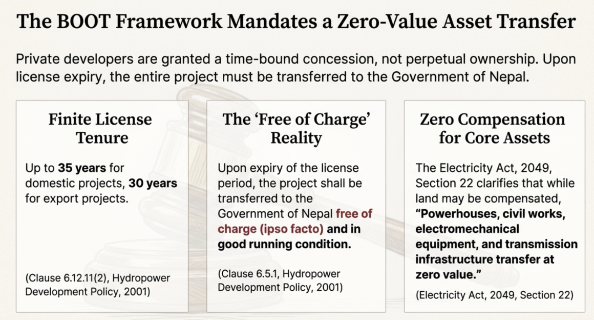 The BOOT model culminates in a legally mandated and economically uncompensated transfer of assets to the Government of Nepal.
