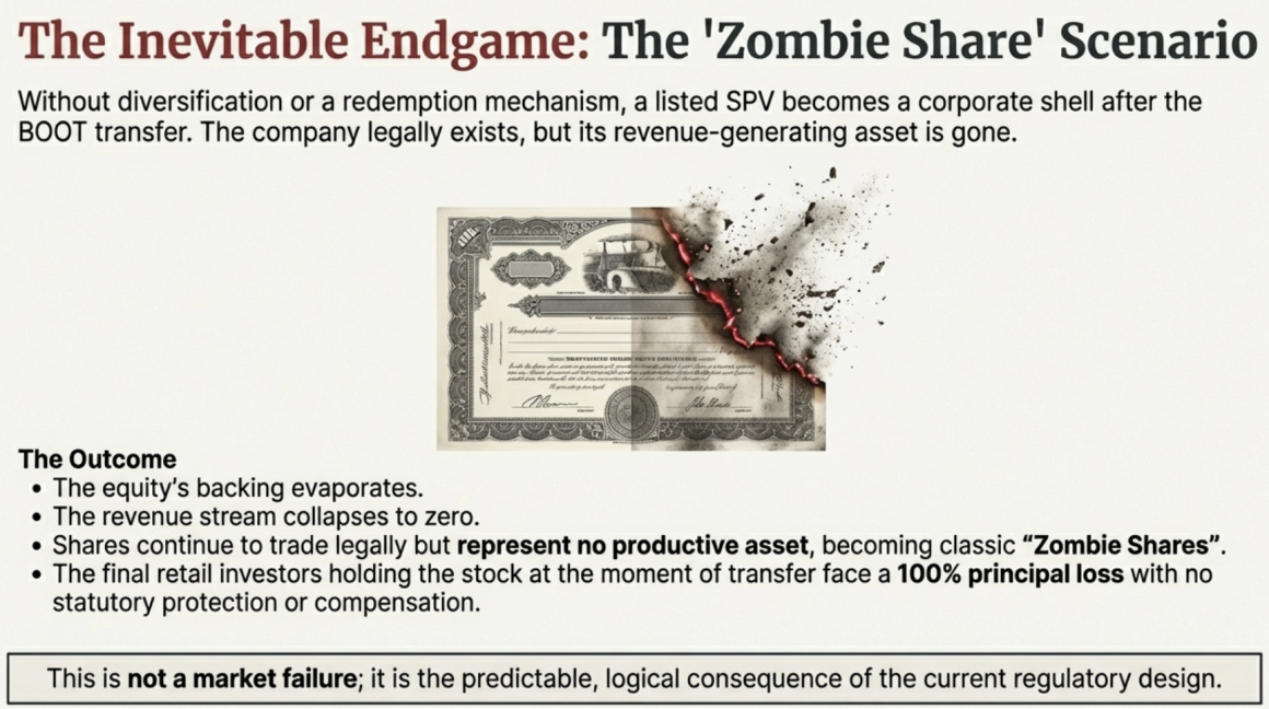- Sanctioning the “Zombie” Structure: By focusing on capital injection rather than the tenure mismatch of the underlying asset, regulators have effectively endorsed “Zombie Share” structures. Temporary debt (which naturally matures) is being replaced by permanent equity for assets that must ultimately be handed over to the government at zero cost.