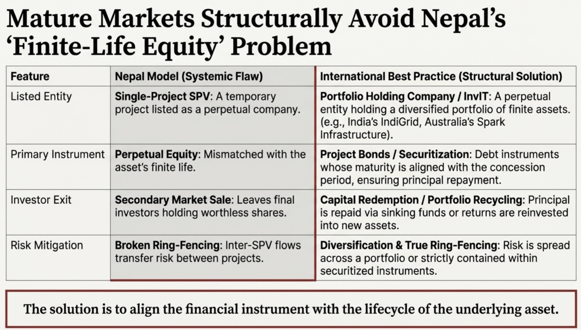 To fully grasp the structural instability of Nepal’s hydropower market, it is instructive to examine how other jurisdictions manage infrastructure projects with finite lifespans. Unlike Nepal, where individual, temporary SPVs are listed as perpetual equities, leading markets design investment instruments that mirror the lifecycle of the underlying asset, aligning risk, return, and exit mechanisms with reality.