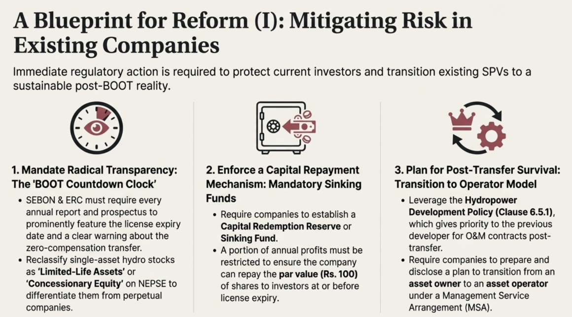 To avert a systemic collapse where public equity is wiped out upon the expiration of generation licenses, Nepal must bridge the regulatory chasm between the Companies Act, 2063 (which assumes corporate perpetuity) and the Electricity Act, 2049 (which mandates asset termination). The following structural and regulatory reforms are necessary to protect retail investors and ensure the long-term health of the capital market.