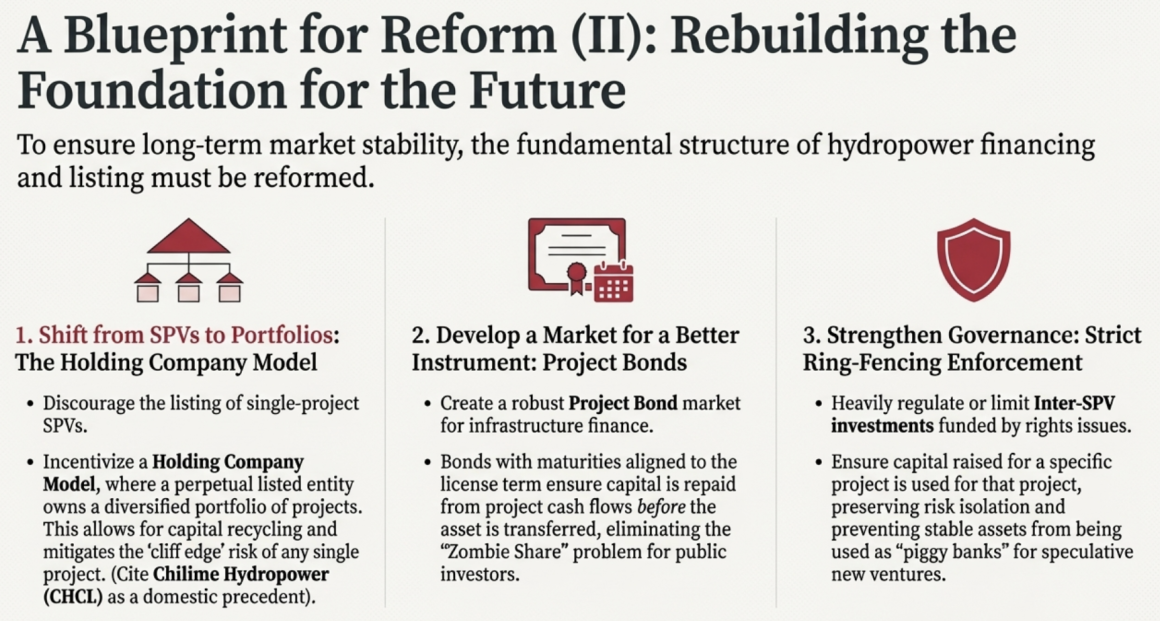 - The Holding Company Model: Portfolio Diversification To match the “perpetual” nature of the stock market, Nepal must shift away from listing individual, finite-life SPVs. Instead, the market should encourage the Holding Company Model, where a perpetual listed entity owns a diversified portfolio of unlisted, finite-life subsidiary SPVs. As one project’s license expires, the parent company survives through its other projects and the reinvestment of capital into new licenses. This model, exemplified de facto by Chilime Hydropower (CHCL), allows for “capital recycling” and reduces the binary risk of a single project’s “cliff edge”.