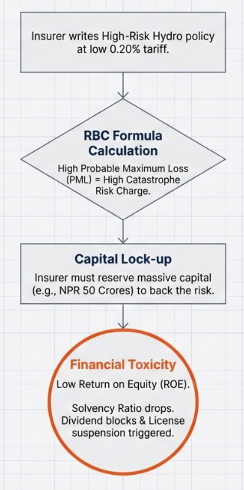 2. Industry-Wide Exposure Limits and Capital Charges: The Reinsurance Directive 2080 already sets a retention limit of 5% of Net Worth per risk and mandates that insurers cannot hold risks they cannot bear. This needs to be enhanced with a “cascade adjustment.” The directive also requires insurers to allocate 10% of profits to a catastrophe fund. This requirement should be explicitly linked to hydropower concentration. If an insurer holds more than 20% of its portfolio in a single river basin, the capital charge under the Risk Based Capital (RBC) framework should be substantially increased to penalize this concentration and incentivize diversification.