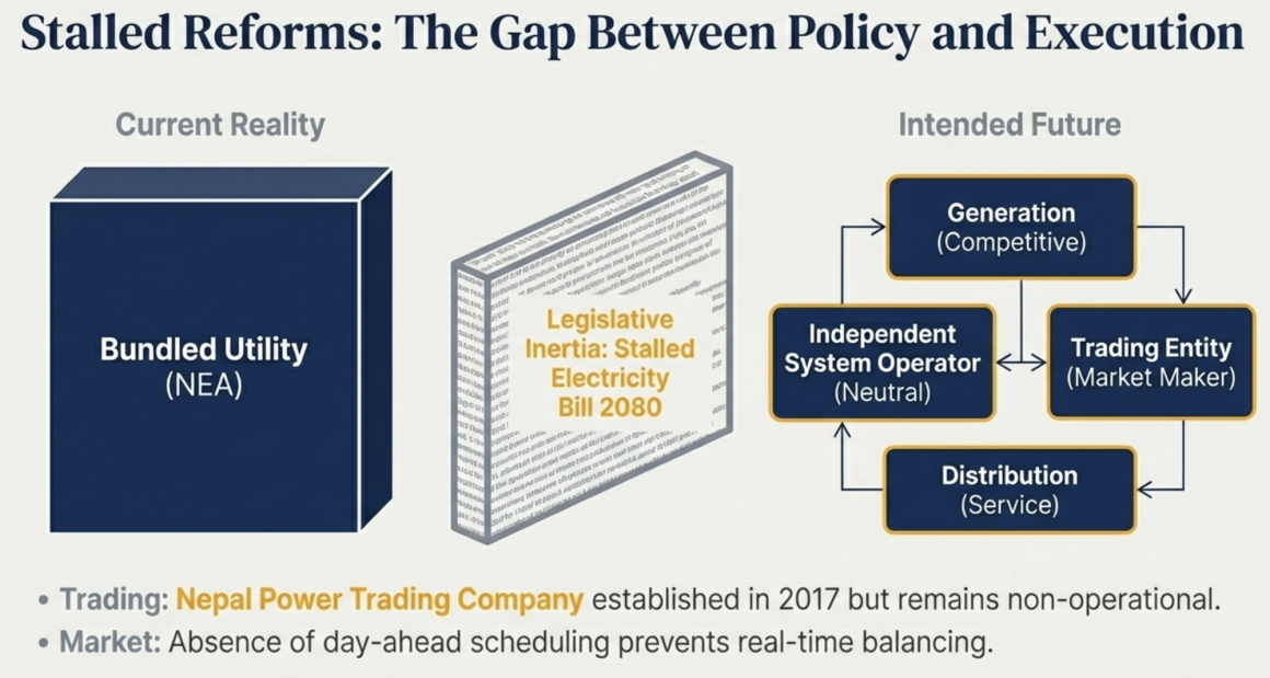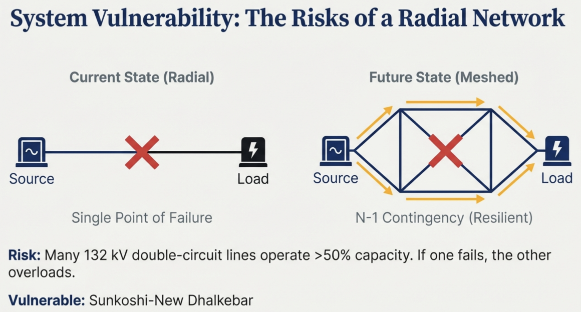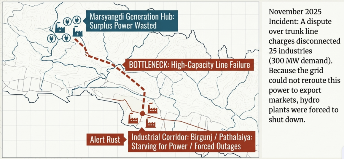 Additional coordination failures further illustrate the extent of the problem. In November 2025, the disconnection of 25 industries representing approximately 300 MW of demand led to forced shutdowns of hydropower plants because surplus electricity could not be immediately exported. Similarly, despite the Dhalkebar–Muzaffarpur transmission line having the capacity to import up to 800 MW, internal high-voltage transmission limitations have prevented effective distribution of imported electricity to domestic load centers.