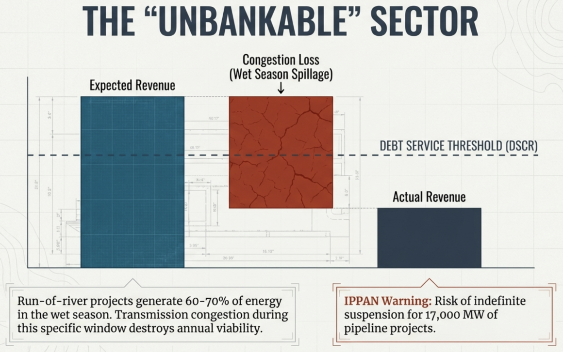 The financial consequences of this shift are severe. Because run-of-river hydropower projects generate approximately 60% to 70% of their annual energy during the wet season, transmission congestion during this period can result in substantial energy losses. For example, if a project generates 100 units of electricity annually but loses 20 units due to transmission constraints, revenue falls by 20%. In practice, such losses can range between 18% and 40% of total income, as reported by IPPAN. This level of revenue loss destroys the Debt Service Coverage Ratio required by banks, rendering projects financially unviable and unfinanceable.