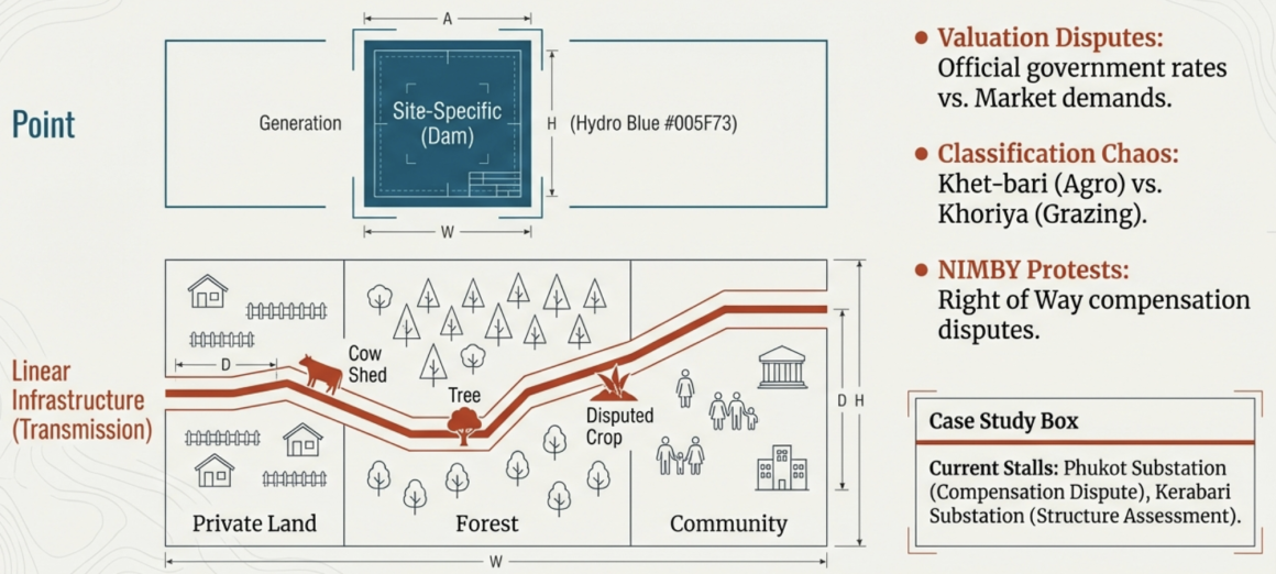 Securing land and Right of Way (RoW) is widely described as a “critical undertaking” and remains one of the most significant causes of delay in transmission projects. There are frequent disputes over land compensation, compounded by difficulties in classifying private land – particularly in distinguishing between agricultural land (khet-bari), grazing land (khoriya), and residential plots (gharedi). The absence of clear and consistent legal provisions governing compensation determination for RoW creates local disputes that can stall construction for extended periods. Unlike generation projects, which are typically confined to specific sites, transmission lines traverse vast distances across multiple jurisdictions, making land acquisition exponentially more complex. This process often requires negotiating with hundreds of individual landowners, each with different expectations, claims, and socio-economic circumstances, creating an enormous administrative burden and increasing the likelihood of prolonged delays.