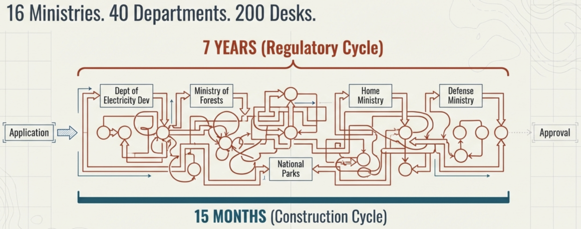 The administrative burden imposed on developers is exceptionally high. Developers must coordinate with as many as seven ministries, twenty-three departments, and navigate thirty-six separate laws to advance a hydropower project. Other stakeholders estimate the burden to be even greater, requiring engagement with fourteen ministries, forty departments, and more than two hundred individual desks or approval points. While the actual physical construction of a hydropower project may take as little as fifteen months, the legal procedures, clearances, and approvals required before construction can begin often extend up to seven years. Despite longstanding demands from investors for a one-window approval mechanism, no effective system has been implemented, forcing developers to physically move files between multiple agencies, often facing delays due to weak accountability and administrative inefficiency.
