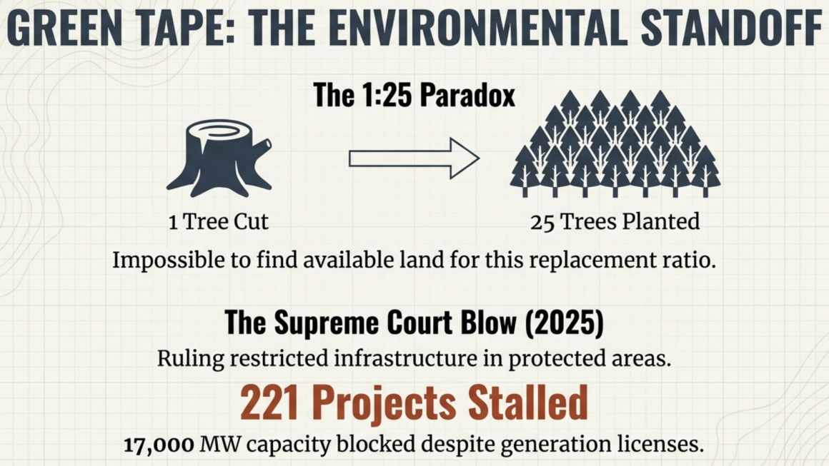 Environmental approval delays are further aggravated by institutional conflicts and procedural inefficiencies. Although EIAs are legally required to be approved within 30 days, approvals frequently take years. Forestry authorities often blame developers for submitting inadequate or “copy-paste” environmental studies, while developers accuse officials of unnecessarily delaying files. Even minor design changes after approval require complete revision of environmental studies, resulting in delays and cost increases amounting to crores of rupees.