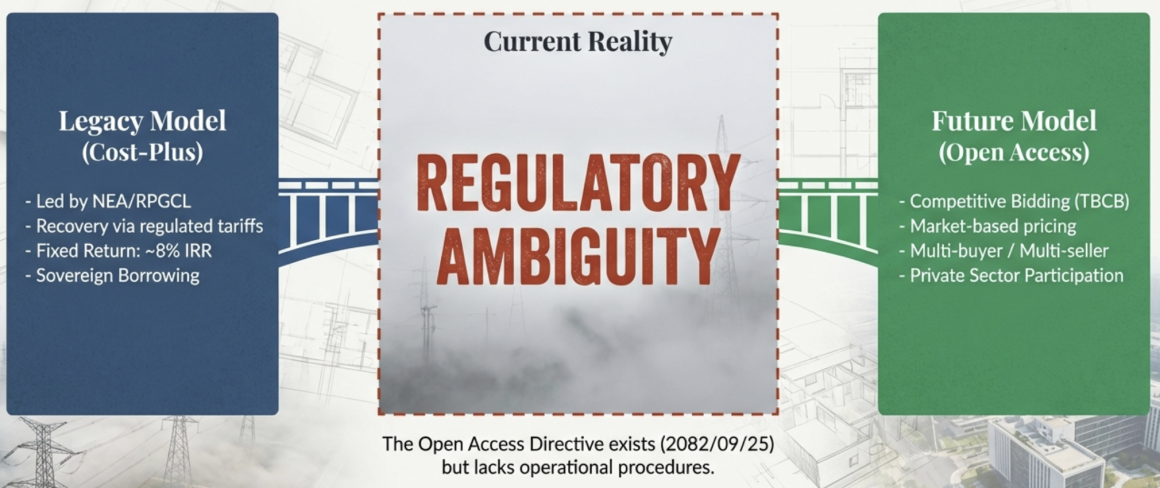 Under the current cost-plus regulatory model, NEA and RPGCL construct transmission infrastructure and recover their investment through regulated wheeling charges designed to ensure a fixed and predictable return, typically around 8% IRR. - Future Framework (Competitive/Open Access):