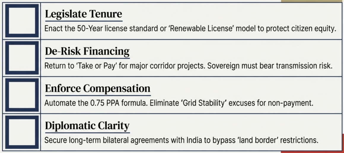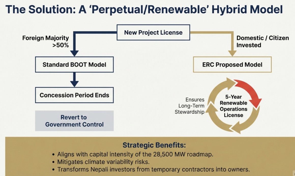 In conclusion, for Nepal’s context, retaining the 50-year model – or transitioning to a renewable license framework for domestic entities – offers clear advantages over the current 25–30 year arrangement. This approach is necessary to secure public investments, align with the “28,500 MW by 2035” roadmap requiring substantial private capital, and mitigate risks associated with climate variability and regulatory delays.
