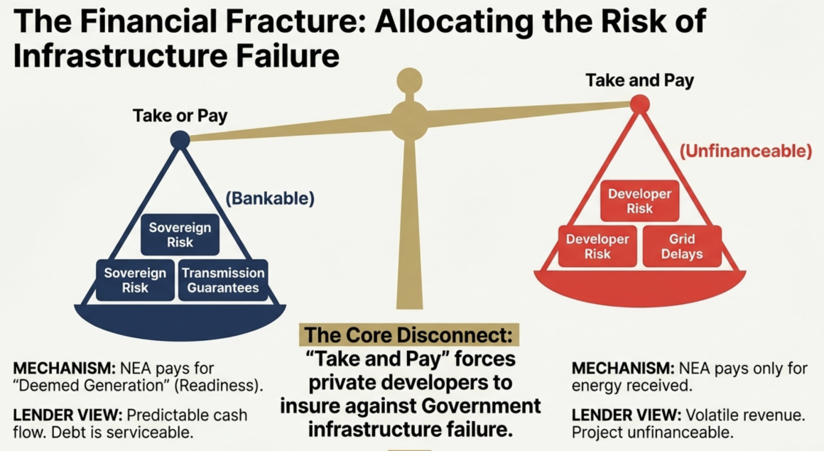The policy shift from “Take or Pay” to “Take and Pay” Power Purchase Agreements fundamentally alters the distribution of financial risk, transferring the burden of transmission delays and market unavailability entirely to private developers. Under the “Take and Pay” framework, developers are compensated only for electricity actually delivered to the grid. If transmission infrastructure is incomplete or market access is unavailable, the authority pays nothing, leaving developers to bear the full cost of capital despite having operational plants. This misalignment renders projects effectively unfinanceable from the perspective of lending institutions, as revenue streams are no longer guaranteed, regardless of whether generation facilities are ready to produce power.