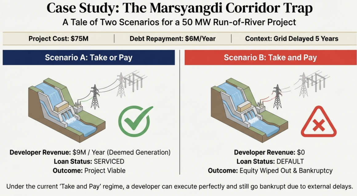 In practical terms, this risk allocation framework has transformed Nepal’s hydropower sector from a predictable, bankable investment environment into one characterized by volatile revenue streams, reduced investor confidence, and increased financing risk. Under the theoretical “Take or Pay” model, revenue stability is high and bankability is strong. Under the current “Take and Pay” reality, revenue stability is low, financial losses range between 18% and 40%, and many projects are considered unfinanceable due to the absence of guaranteed transmission access and payment security.