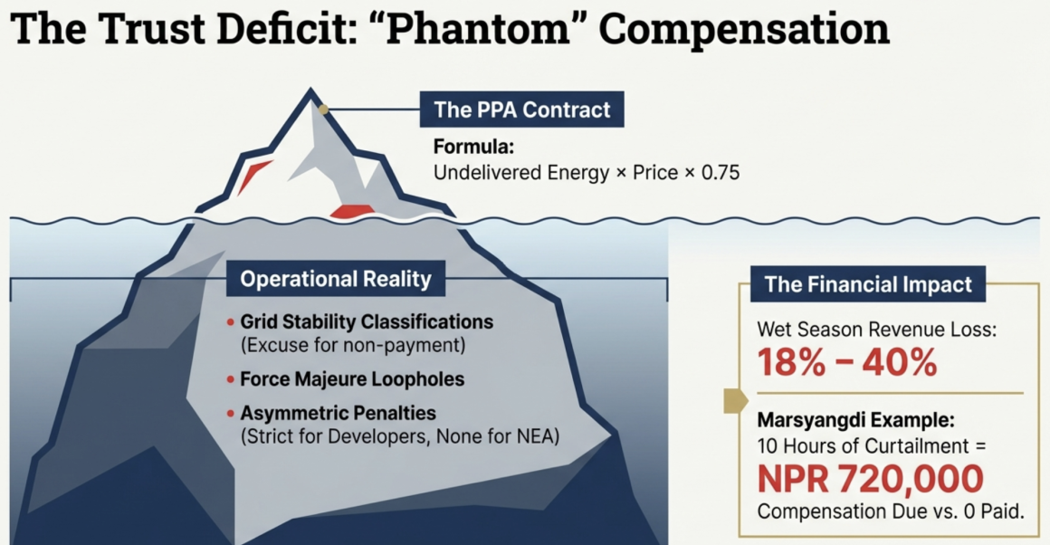 Although Power Purchase Agreements formally provide for compensation for “Undelivered Energy” resulting from dispatch instructions or curtailment, this provision is rarely implemented in practice. Because the NEA controls the Load Dispatch Center, curtailments are often classified as technical or grid stability requirements rather than commercial failures, allowing the utility to avoid compensation obligations. As a result, developers bear the full financial impact of curtailment.