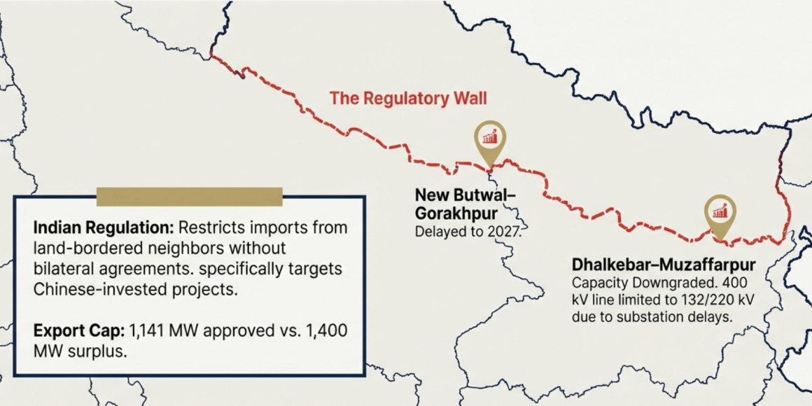 - During the wet season of 2025, Nepal generated a 1,400 MW surplus, but Indian export approvals were limited to approximately 1,141 MW, forcing significant spillage at NEA power stations. This demonstrates that the regulatory cap, not just infrastructure, is a binding constraint on cross-border trade.