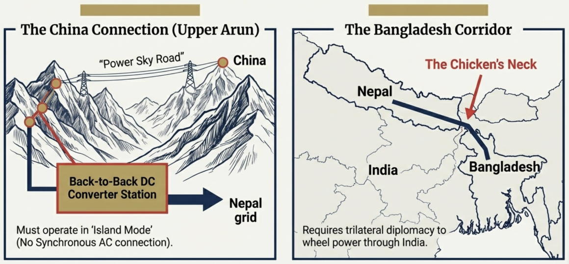 - Technical Challenge (Synchronization): Nepal’s grid is tied to India’s grid; synchronization with China’s grid requires Back-to-Back DC converter stations operating in “Isolation Mode” rather than a synchronous AC connection, adding significant technical complexity and cost.