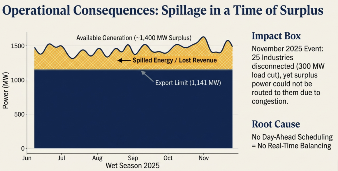 Coordination failures have also been exacerbated by abrupt changes in domestic demand that transmission and export systems are unable to accommodate in real time. In November 2025, a dispute regarding dedicated trunk line charges led to the disconnection of 25 industries representing approximately 300 MW of demand. This sudden drop in domestic load, combined with the inability to immediately export surplus electricity due to infrastructure and protocol limitations, forced certain hydropower projects to shut down generation, resulting in additional financial losses and inefficiencies.