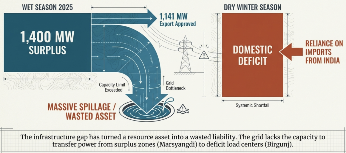 The wet season of 2025 further demonstrated the magnitude of this problem. During this period, Nepal’s electricity generation surplus reached approximately 1,400 MW. However, export approvals and transmission constraints limited exports to only 1,141 MW, resulting in significant spillage of electricity. The available evidence indicates that this spillage occurred primarily at NEA-owned generation facilities, highlighting the systemic nature of the transmission bottleneck.