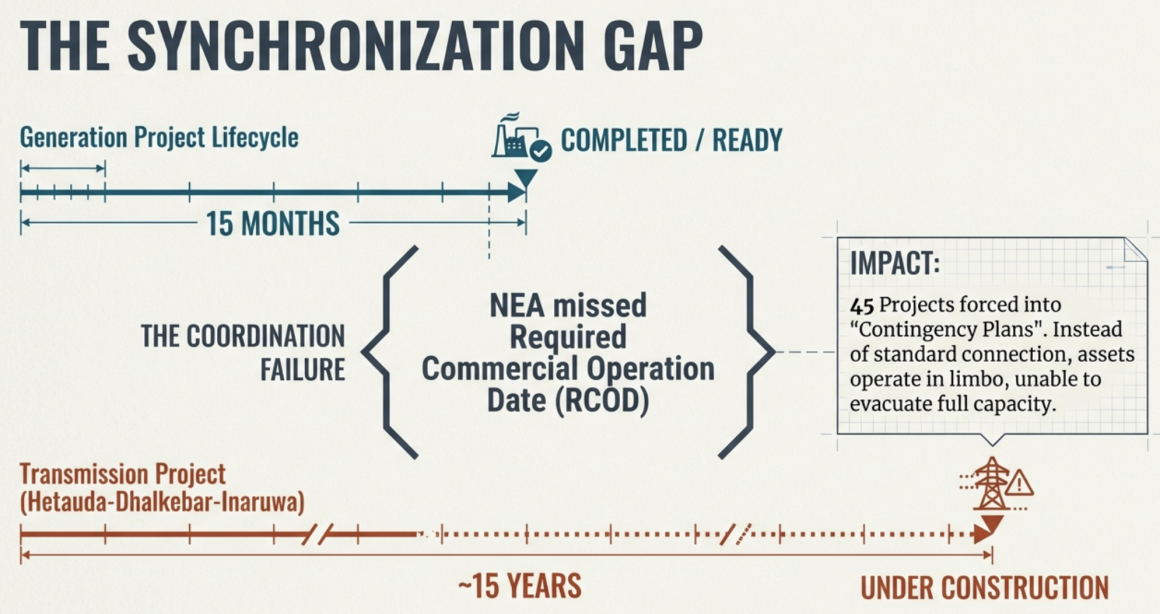 The most prominent structural challenge in Nepal’s power sector is the persistent infrastructure bottleneck in which generation projects are completed before the necessary evacuation infrastructure becomes operational, resulting in significant energy spillage and wastage. This coordination failure creates a classic “chicken-egg” dilemma: transmission infrastructure requires confirmed generation capacity to be financially viable, while generation projects require assured transmission availability to be bankable. When these timelines are misaligned, the consequences are severe and financially damaging. Approximately 45 hydropower projects have been forced to operate under “Contingency Plans” due to the Nepal Electricity Authority’s (NEA) failure to complete transmission lines and substations by the Required Commercial Operation Date (RCOD). Instead of benefiting from the standard “Take or Pay” protection, these projects were compelled to accept a “Take and Pay” arrangement, resulting in operating losses ranging from 18% to 40% of their expected income because they were unable to evacuate their full generation capacity.