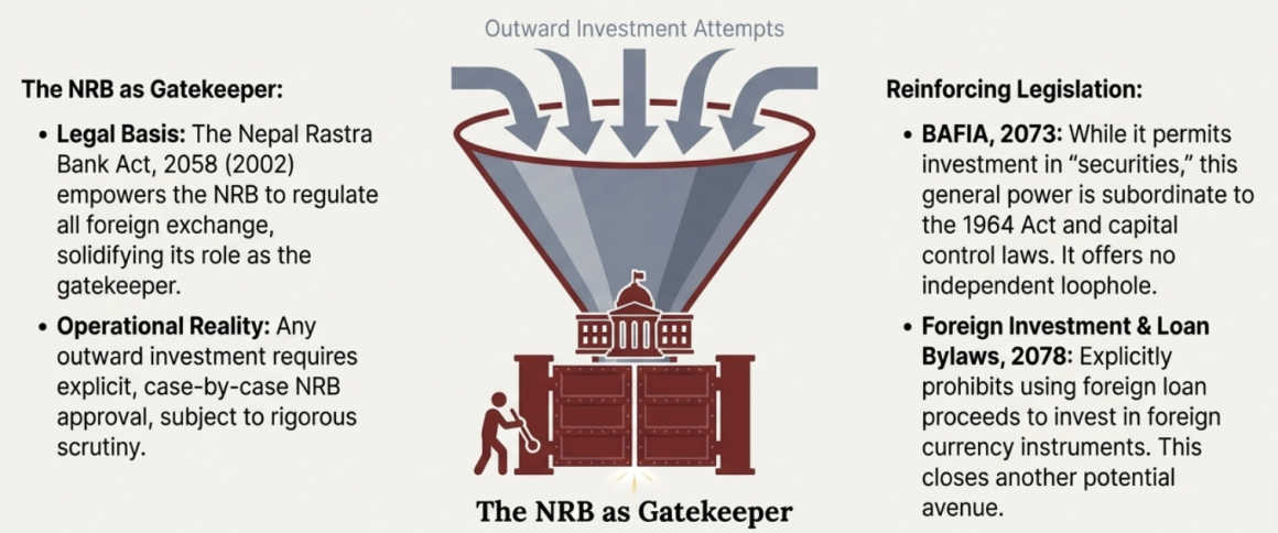 The existence of these investments is possible due to a specific legal mechanism. While the Act Restricting Investment Abroad, 2021 (1964) establishes a strict baseline by mandating that “no person shall make any kind of investment abroad”, the legislative framework governing the Nepal Rastra Bank (NRB) allows for regulatory exceptions.