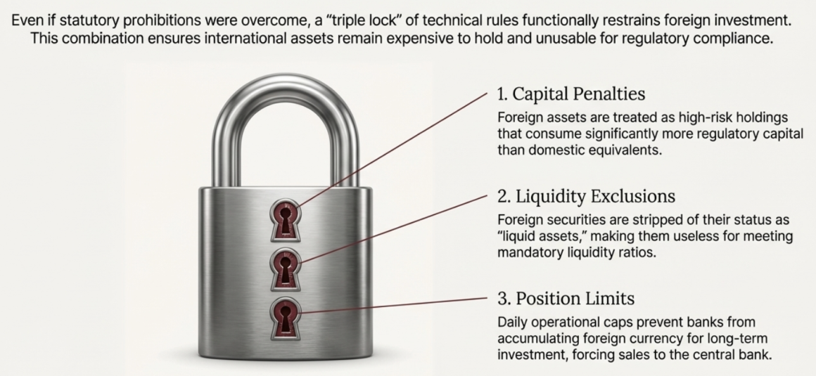 The technical permissions for foreign investment are functionally restrained by a “triple lock” of capital charges, liquidity exclusions, and position limits. This combination ensures international assets remain expensive to hold and unusable for regulatory compliance, creating a powerful disincentive for banks.