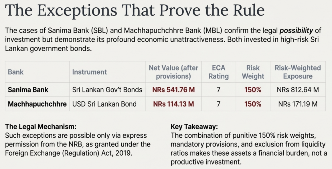 • The Gazette Exception: The only legal exception is a specific authorization published by the Government of Nepal in the Nepal Gazette. This exception has not been broadly granted for commercial portfolio investments by banks.
