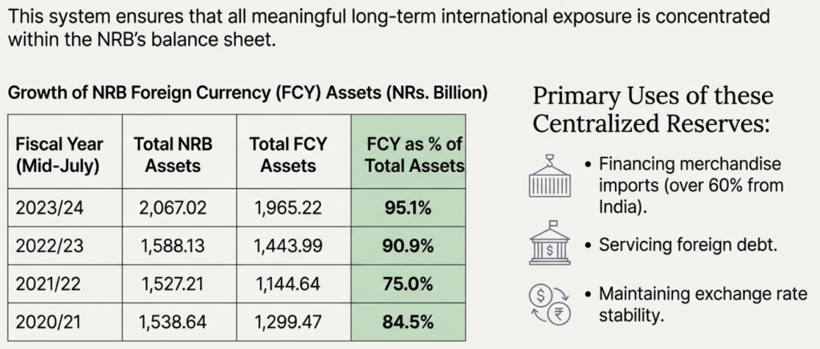 This mechanism ensures the massive accumulation of foreign assets is centralized at the NRB.
